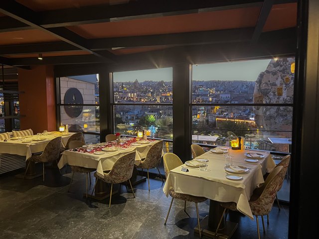 奇岩が目の前にあり、カッパドキアの街並みを一望できるこちらのレストラン、明るい時間帯もとっても良い雰囲気なのですが、
