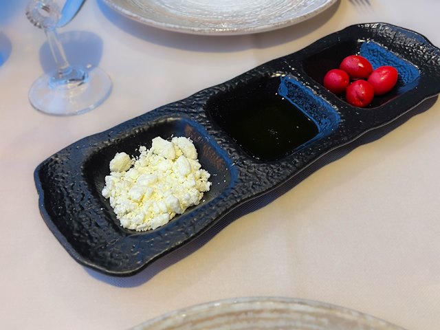 カッテージチーズ、オリーブオイル、オリーブと一緒。