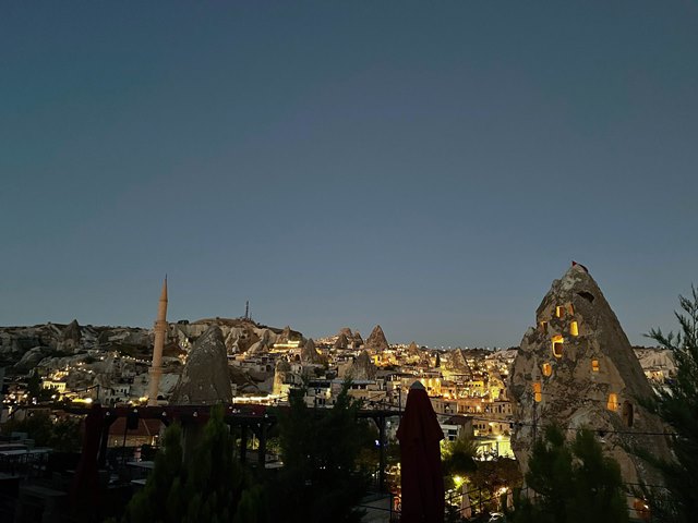 早朝のレストランの雰囲気。濃藍色の空、奇岩、ギョレメのライトアップが息をのむほど綺麗!