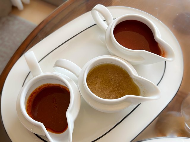 3種類のソースは、スパイスの効いたトマトソース、シャッタ(唐辛子)、ガーリックソース。