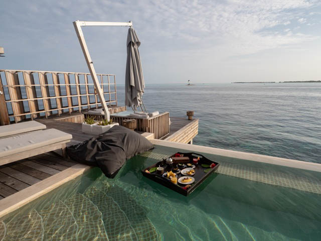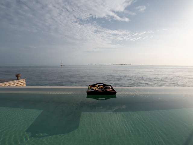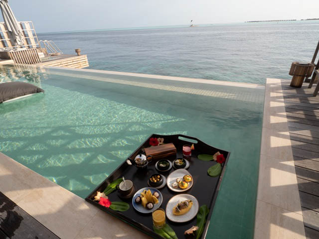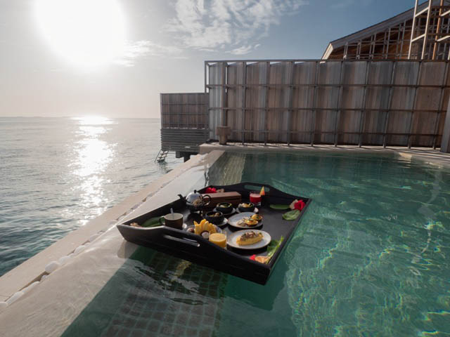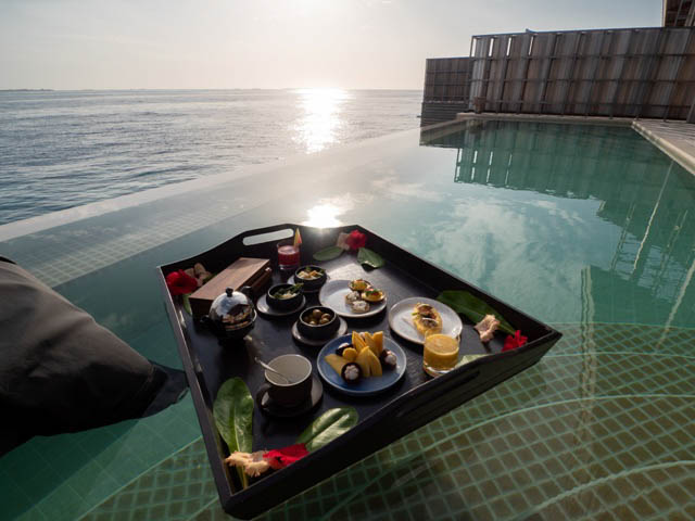 数年前に、バリで流行り始めたフローティングブレックファーストが、最近はモルディブでも取り入れるリゾートが多くなってきたみたいです。