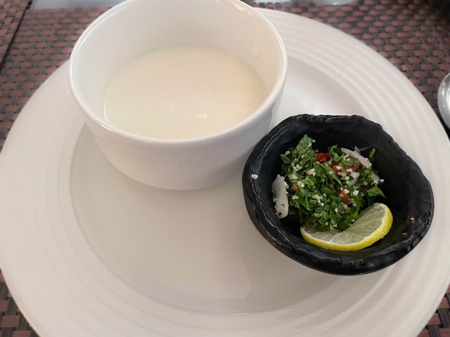 ここからは、いただいたお料理の写真です。この白いのがチキンクリームスープ。コクがあって美味しかった。