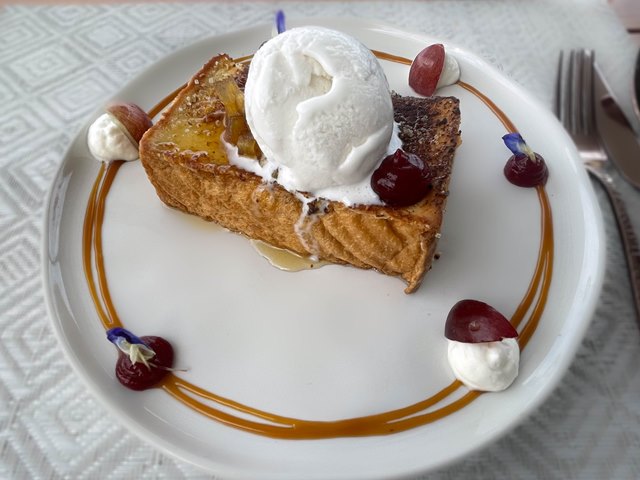 上にざらめがかかっていて、カラメル状になっていて、ココナッツアイスクリームとすごく合う!!周りのベリーとキャラメルのソースも素晴らしく美味しかった😊