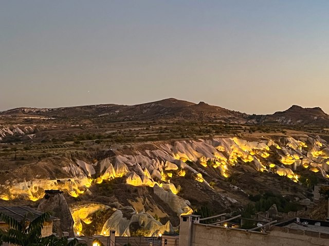 日が沈んだ後のウチヒサールの街とホワイトバレー。
